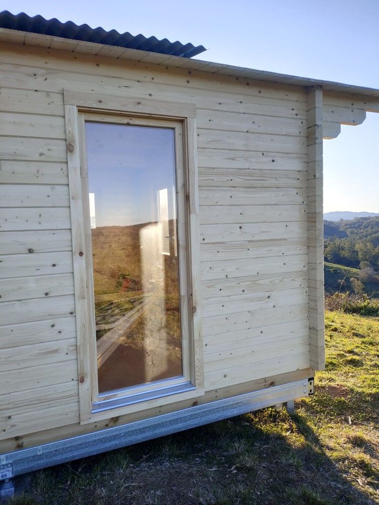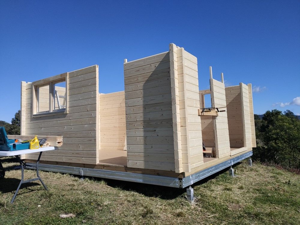 This custom design cabin features two full-height windows that can still be used as doors due to their European design tilt'n'turn opening function. As the winds were picking up we clamped on a temporary brace to stabilise a small wall section at the front of the cabin. Full structural integrity is only created once the top wall connector beams are placed.