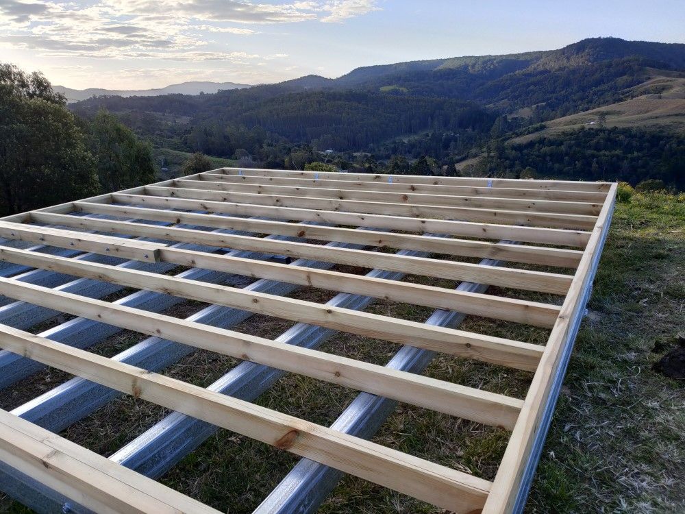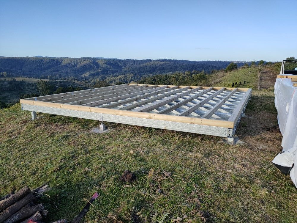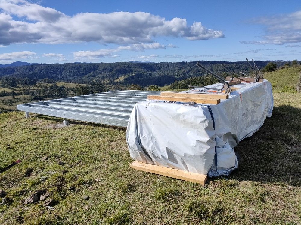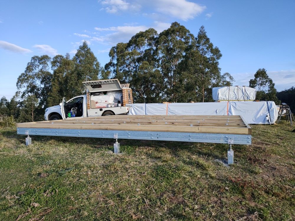 The delivery of the cabin happened over a couple of days, so all materials were on site when we started the foundations. A total of 9 height adjustable stumps were concreted into the ground. The centre stump was fitted with a SHS cross-brace supporting the two centre purlins.