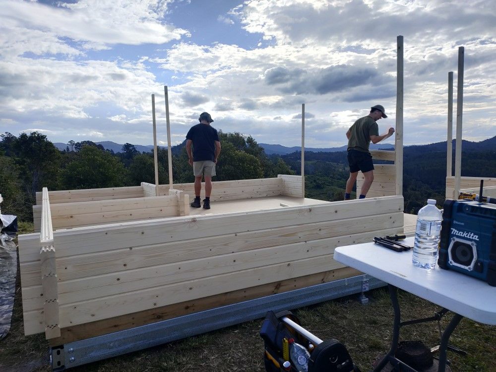 There are several electrical holes pre-drilled through the centre of the logs. We place the first row of logs and then extend these though the treated pine base frame to allow cables to be run from underneath the cabin. From there it's building up the log walls. Logs are all numbered individually and must be placed in the exact position indicated as per the drawings provided.