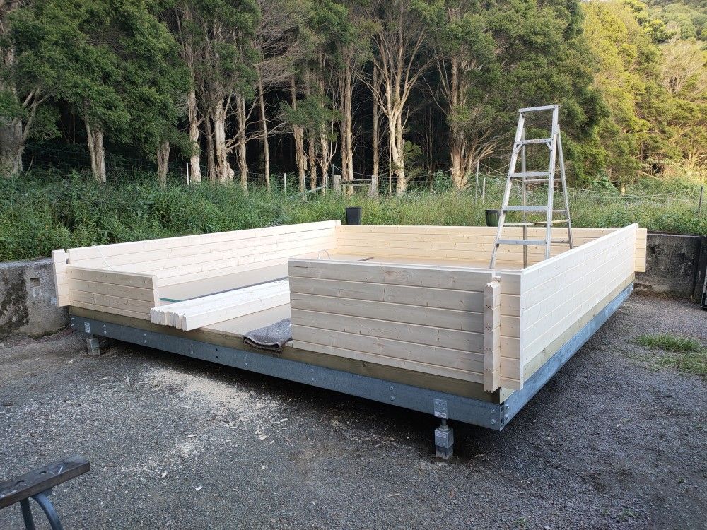 The treated pine base frame comes with your cabin, and fits neatly on top of the steel frame, extending about 5mm past the steel frame to allow rain water to run off the sides.