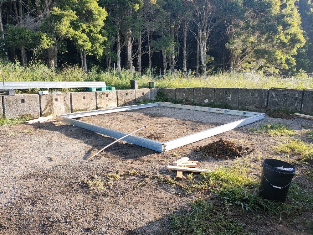 When installing a steel "C" purlin base frame it is best to initially work with the outer frame only. This allows for easy lifting of the frame while working on squaring the base up, as well as getting the base roughly leveled. Once we had the exact position of the 4 outer post holes marked, we moved the base frame away to commence a "little digging" - using just a metal fencing bar and a clam shell digger.