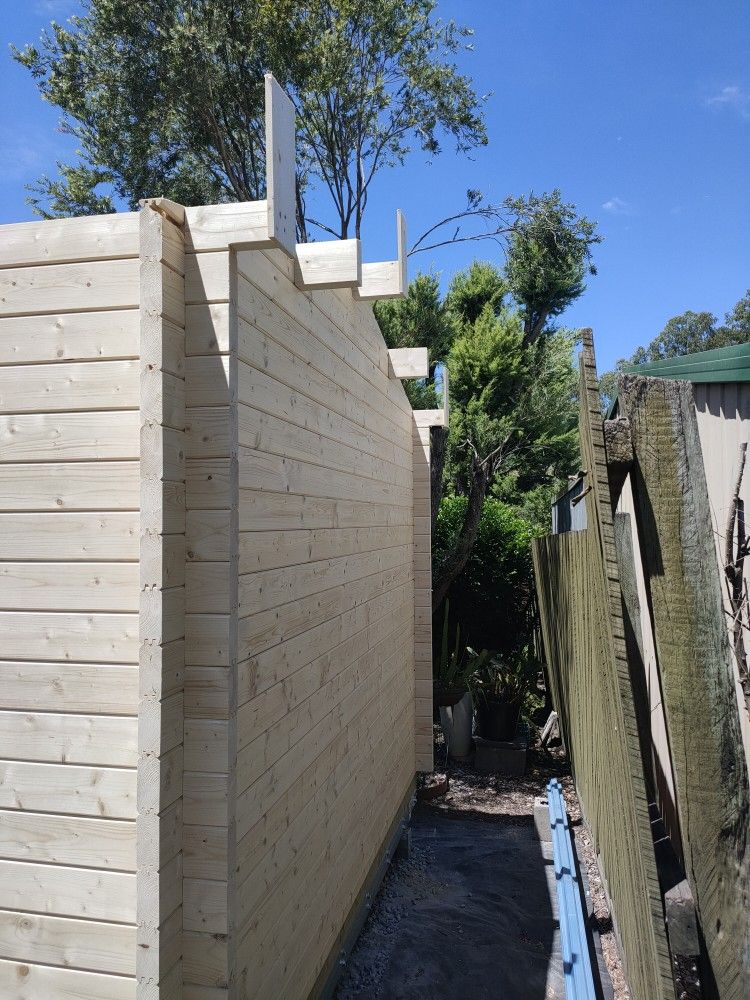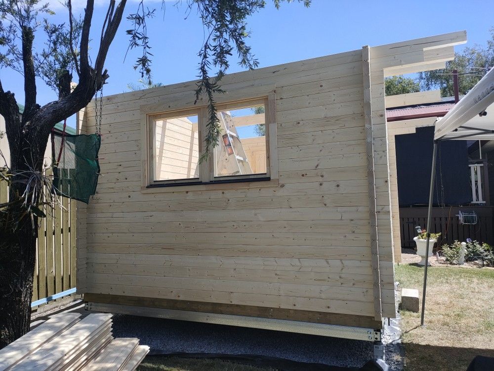 Access to the rear of Debra and Jeff's property was a little tight, to say the least. But we love a challenge, we managed to park our 8m trailer with the cabin pallet close to the build site, and set up our tools and workshop right next to the build area.