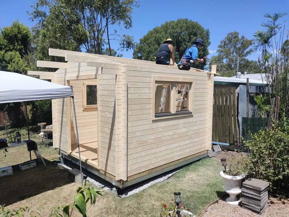 We opt screwing these boards down using galvanised outdoor screws of 45mm length, we do not use the chrome coated shiny nails often supplied with European made cabins. Our strong winds and tropical cyclones necessitate different construction methods than what is used overseas.