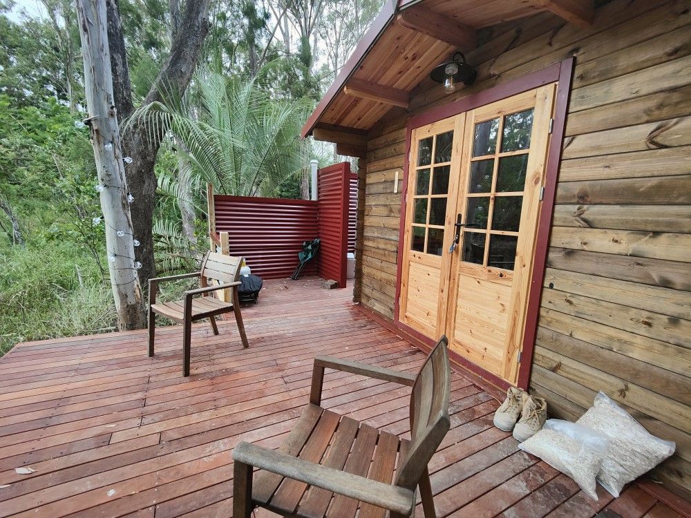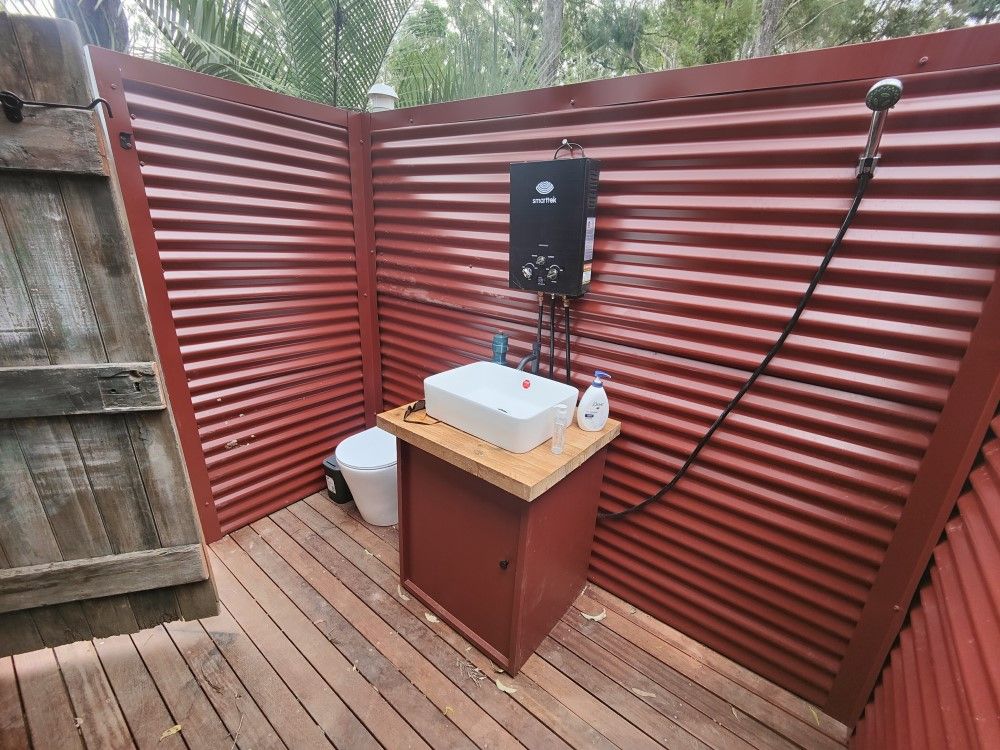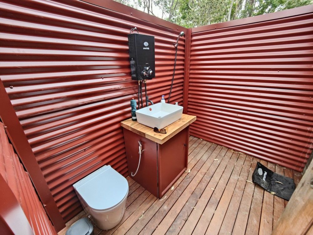 A simple camp shower provides running hot water for a hot shower, and a small vanity unit and a composting toilet provide all basic facilities.