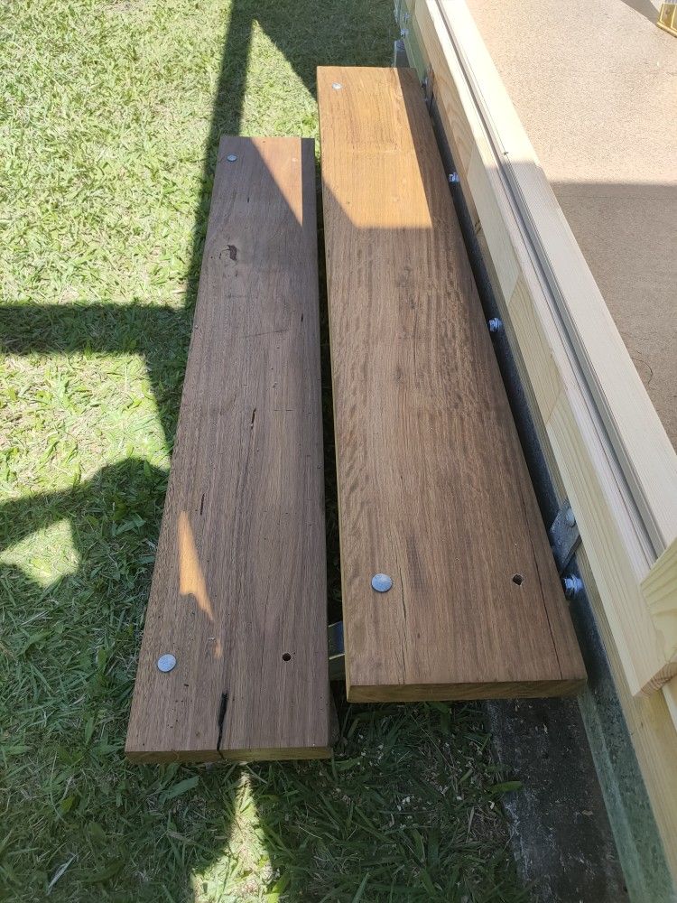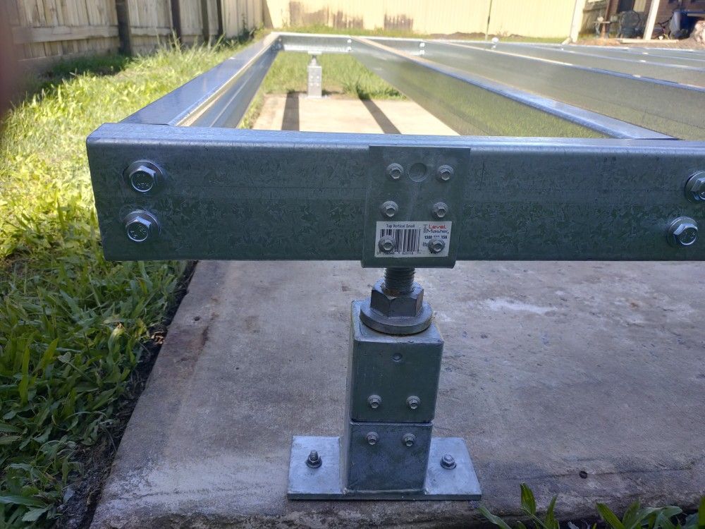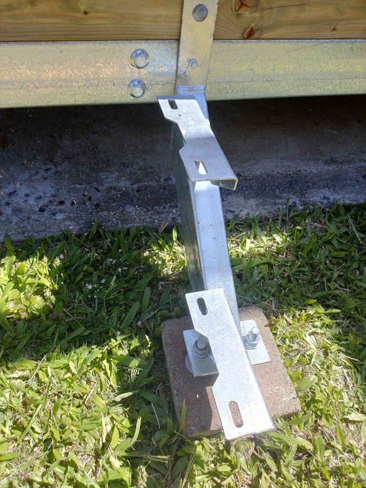 Instead of concreting the four support posts into the ground, we used bolt-down feet, still using height adjustable post tops. This enables Eileen to raise the entire cabin by a further about 200mm in case of local flooding. For ease of access to the cabin we also installed a 2-step stringer and 1.5m wide hardwood steps. The stringers are also height adjustable, so can be raised together with the cabin if need be (see below).