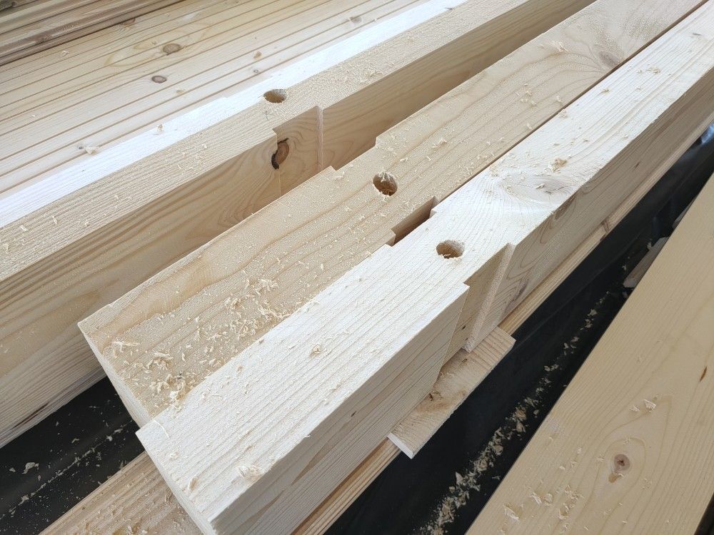 Recently, we started to affix the roof beams to the log walls using 200mm HD gal steel batten screws. These are normally NOT needed, as the roof beams are rebated and fit neatly into slots that have been routed into the wall log. The rebates show nicely on the image on the very right. The holes through the centre of the roof beam joints are rebated, allowing the batten screw heads to sit below the top of the roof beam.