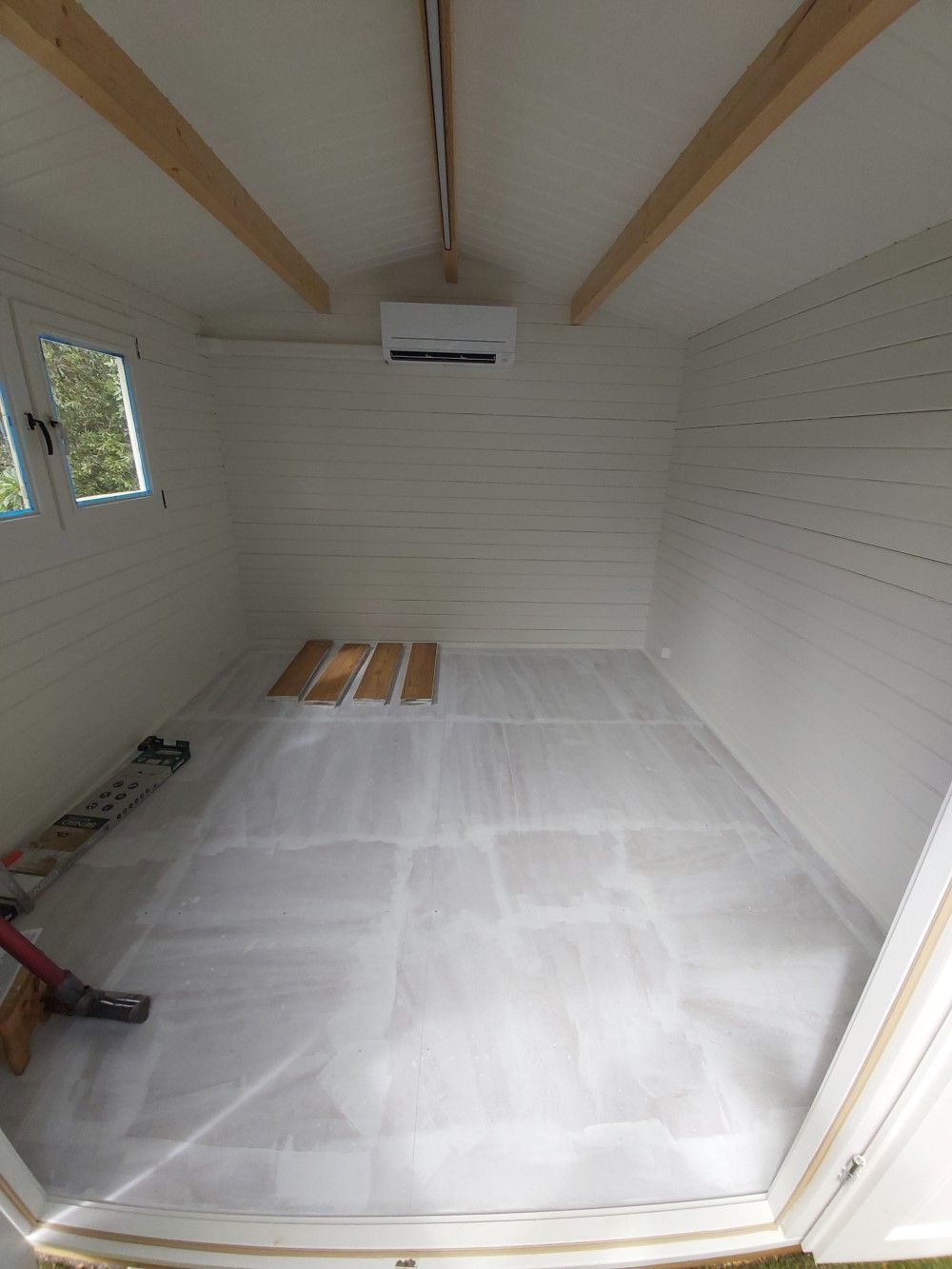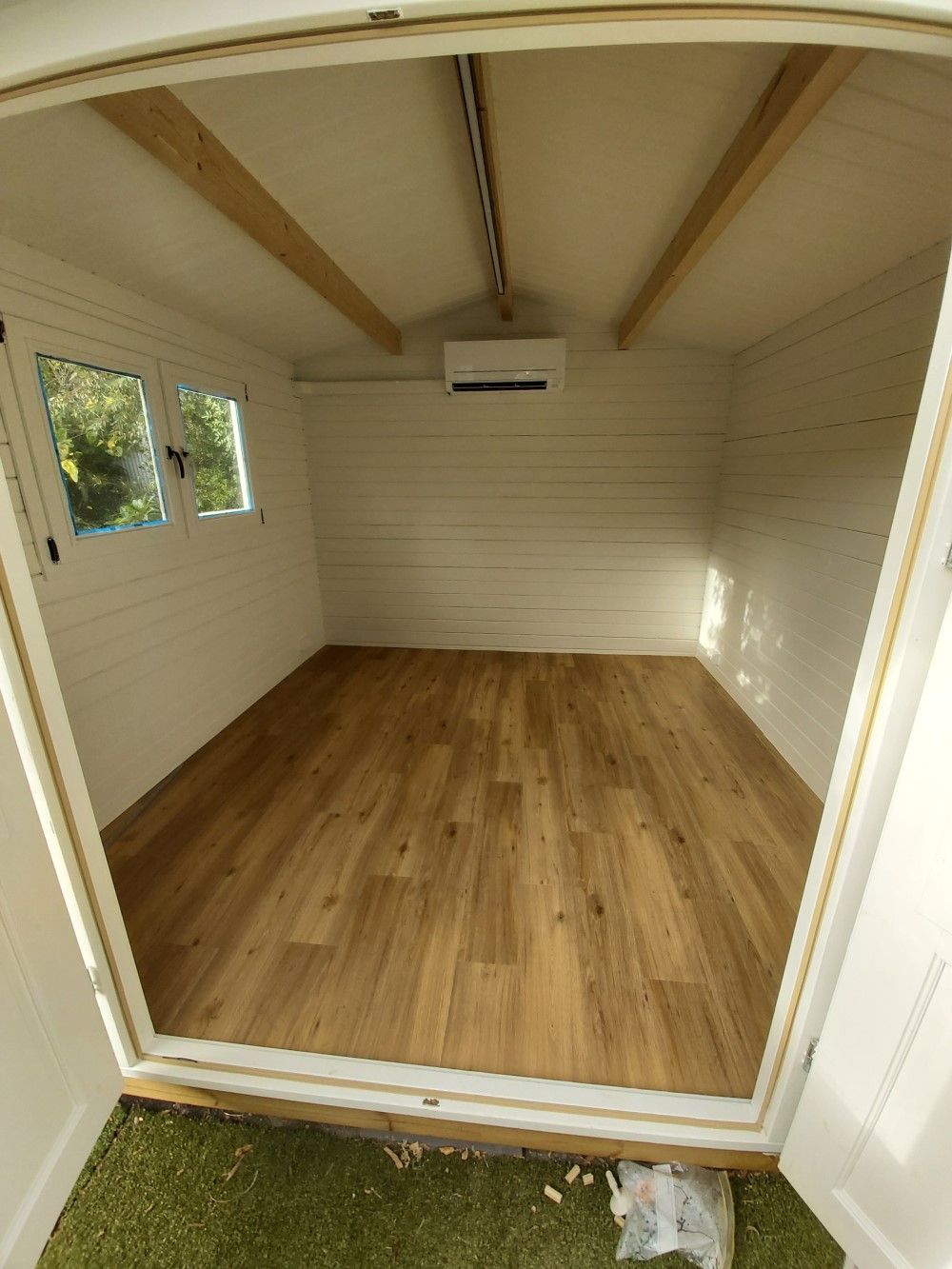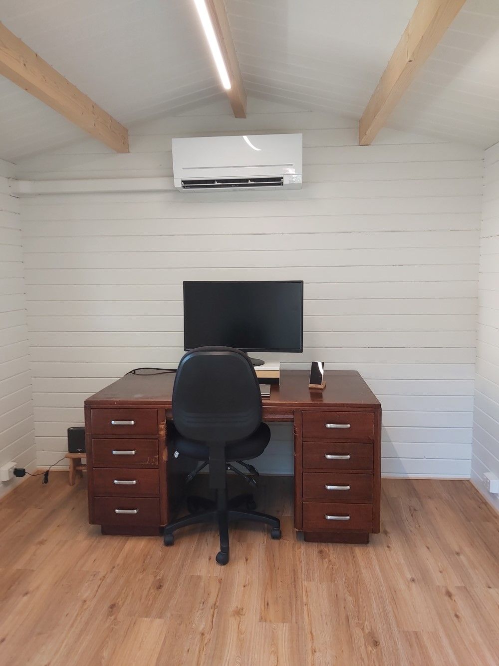 I am using the cabin as my full-time office. It has been fully hardwired and has a 2.5kw air conditioning unit installed. Internet is via a WiFi connection. We painted the inside and outside of the cabin with a heavy duty/mold resistant primer and than three coats of Dulux 'South Pole'. We applied a very clear varnish to the timber beams. We installed a 1.8m long LED light on the centre beam and an oyster light on the outside. We put a coat of primer on the termifloor and than laid GerFlor Vinyl planks. We used 12mm triangle pine moldings as a skirting board.