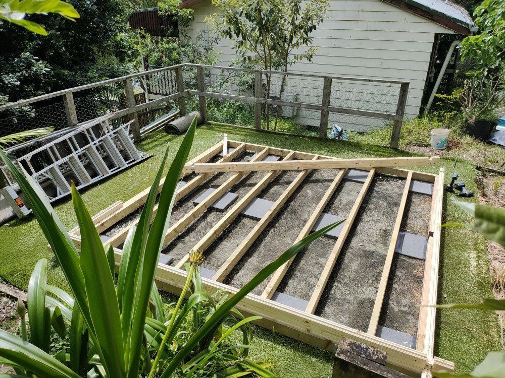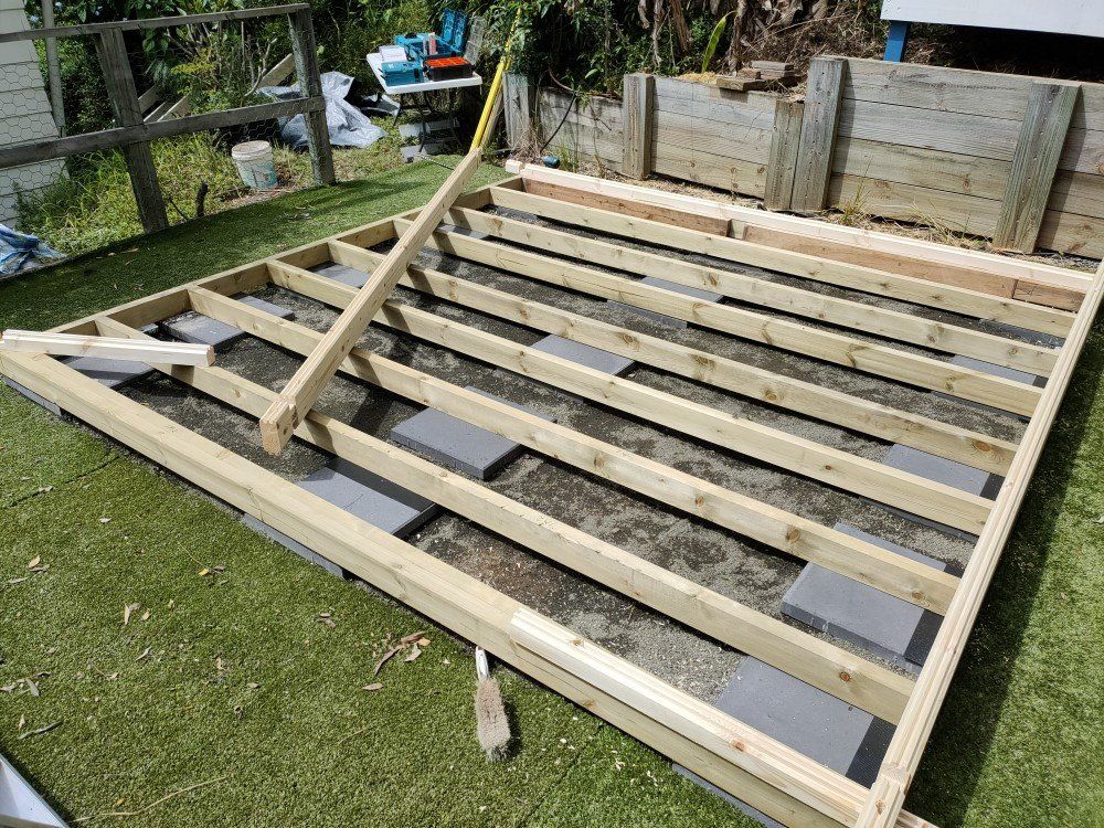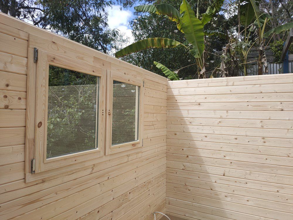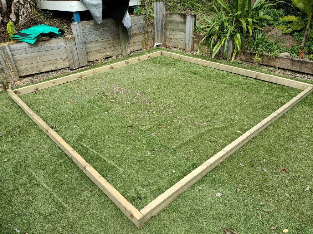 The H2 treated pine base frame in full size 45 x 95mm comes with your cabin. It is of utmost importance to level this frame out as close to perfect as possible, AND to also square it up by measuring diagonally from one corner to the opposite corner - both measurements should be the exact same. For the SAM10 this would be 4,455mm. Once this has been achieved the actual cabin assembly will be so much easier, as everyhting lines up and is plumb and square and level - piece of cake!