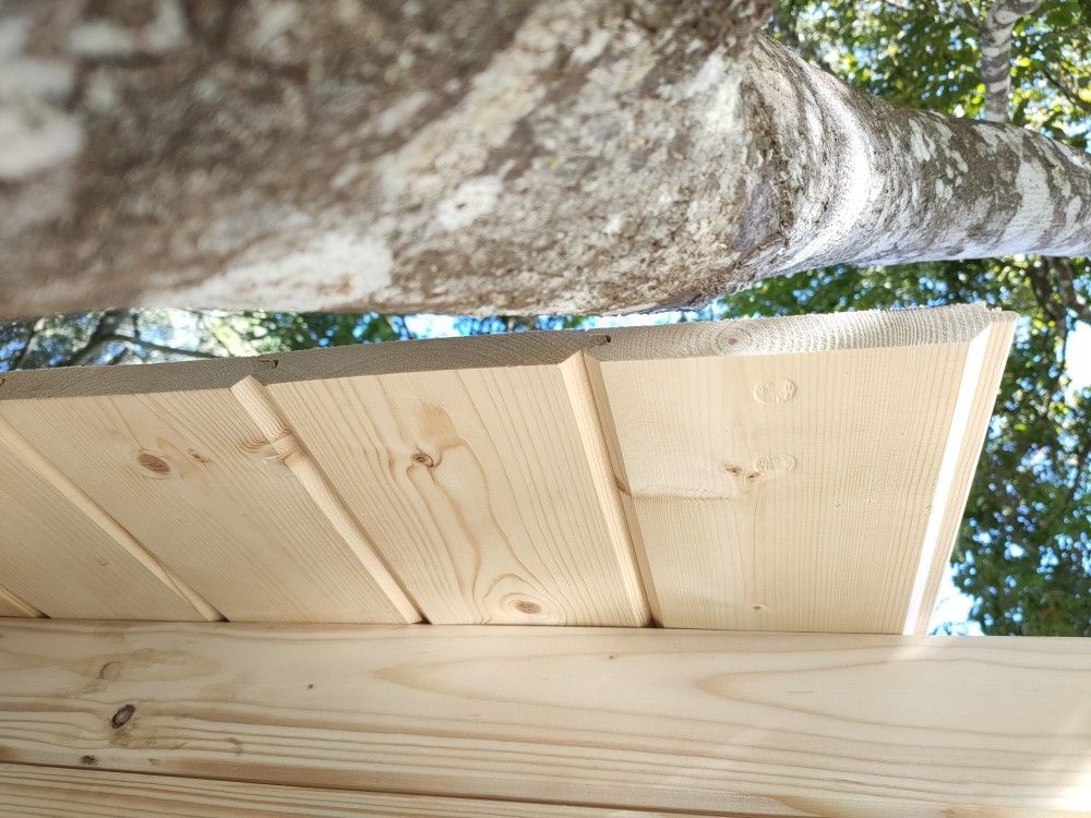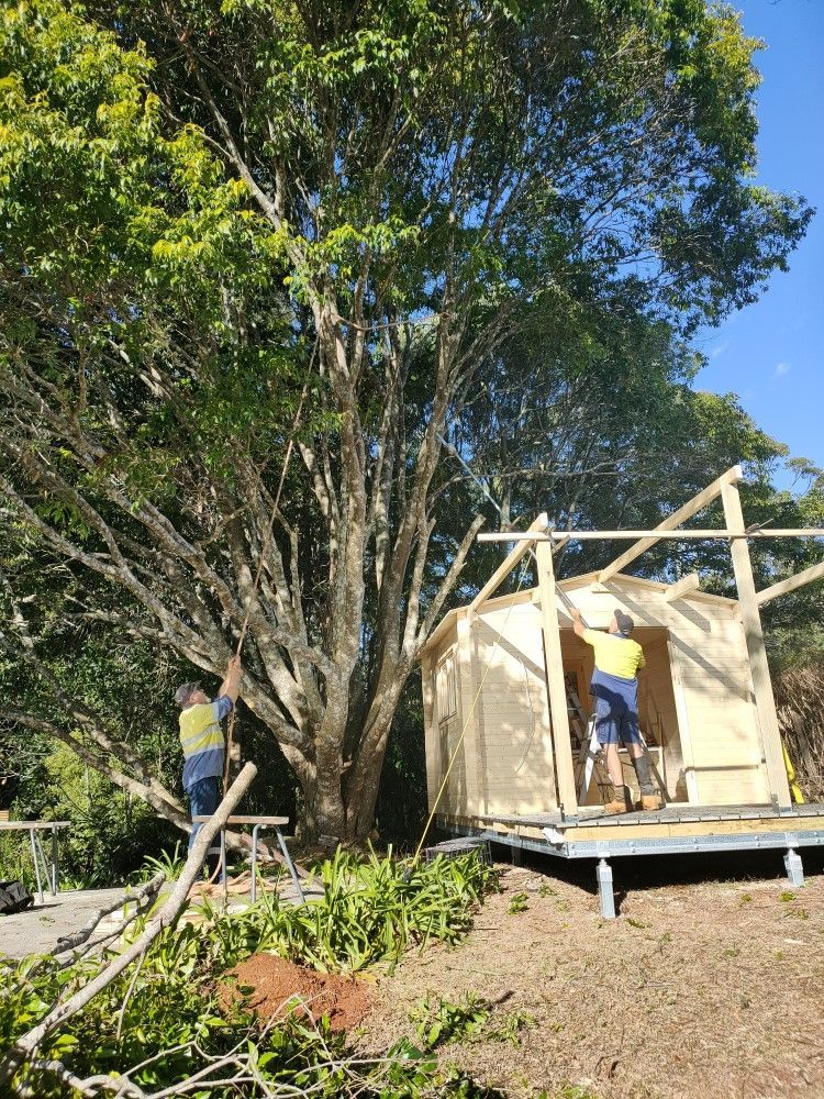 Ideally the area of the cabin build site is level and cleared to about 2 meters all round, but that is often not possible. After observing minimum distances from the fence the cabin looked like fitting nicely in the available space - but already the roof boards JUST cleared a large tree branch, and there was still the corrugated iron sheeting to go on. Our local tree loppers were luckily available to help at short notice, and within an hour the "offending" branch was trimmed back...