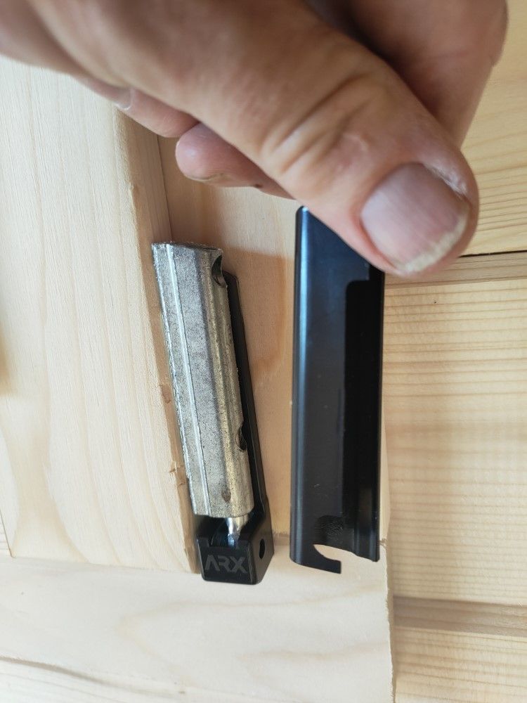 Next, pick the correct cover as pictured, noting the round cut-out section at the bottom for the right hand hinge (the left hand hinge cover is a mirror image of the right hand one). Slide this piece on to the hinge from the side until it clicks in.