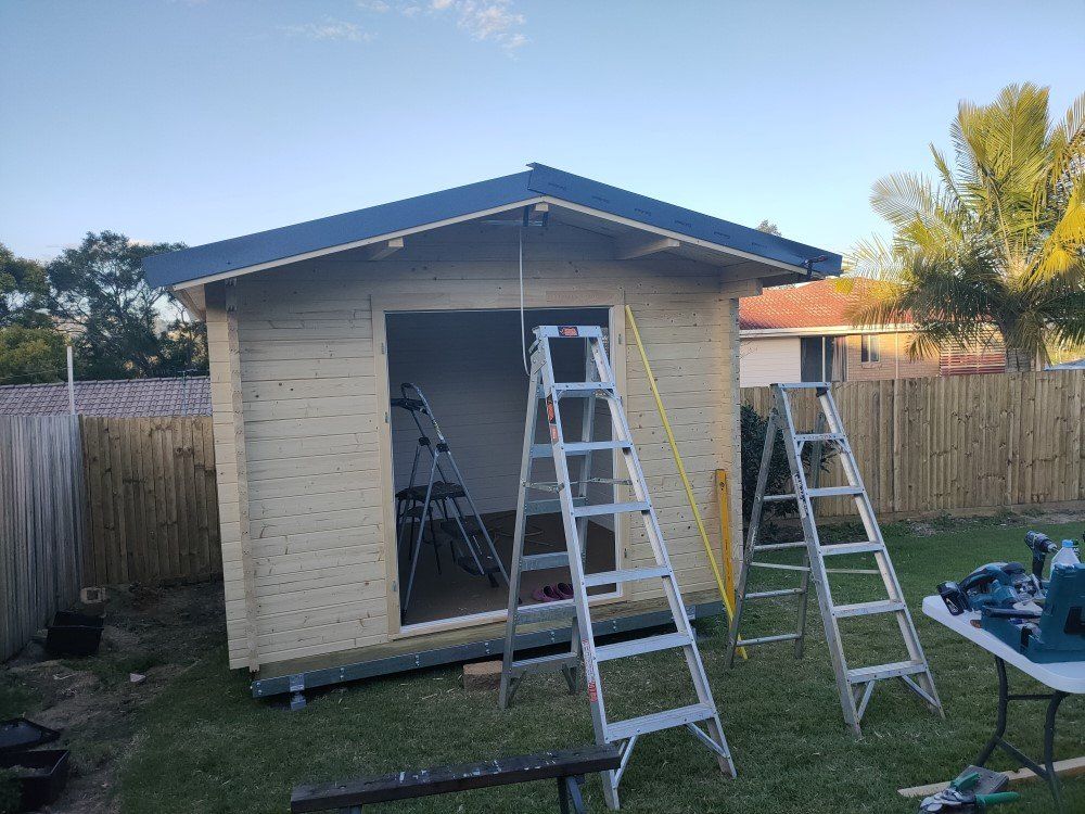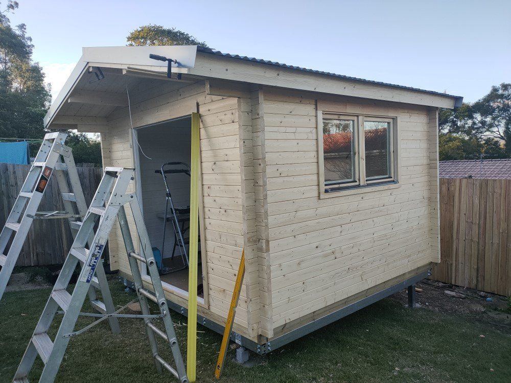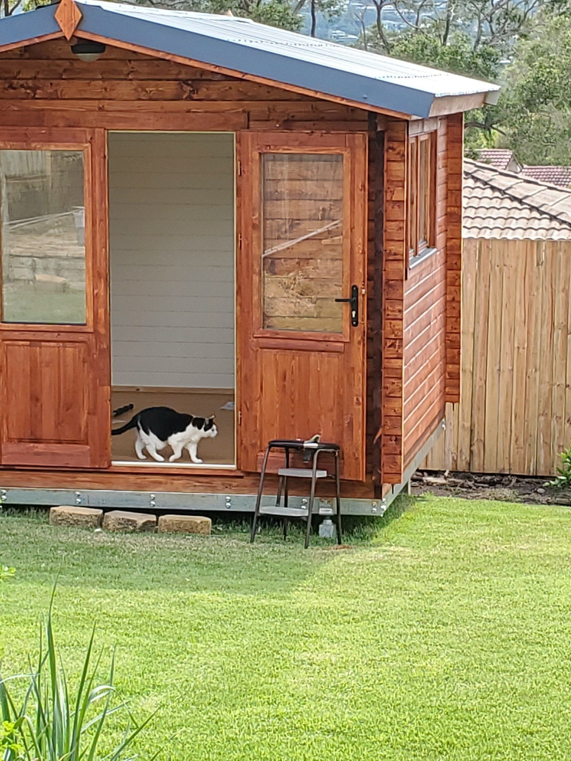 Stef and Jun wanted a break-out office space and our SAM10 model was the perfect solution. Access to the backyard was limited, but luckily with the help of family and friends unloading and carrying all logs etc into the backyard was done quite quickly. The cabin was named after Stef's cat "Fat Hallies"