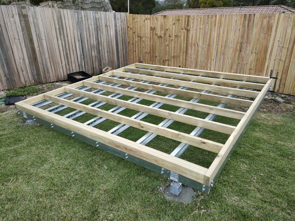 Your cabin will come with chunky treated pine base beams that are placed directly on to the steel "C" purlins, secured with gal steel angle brackets.