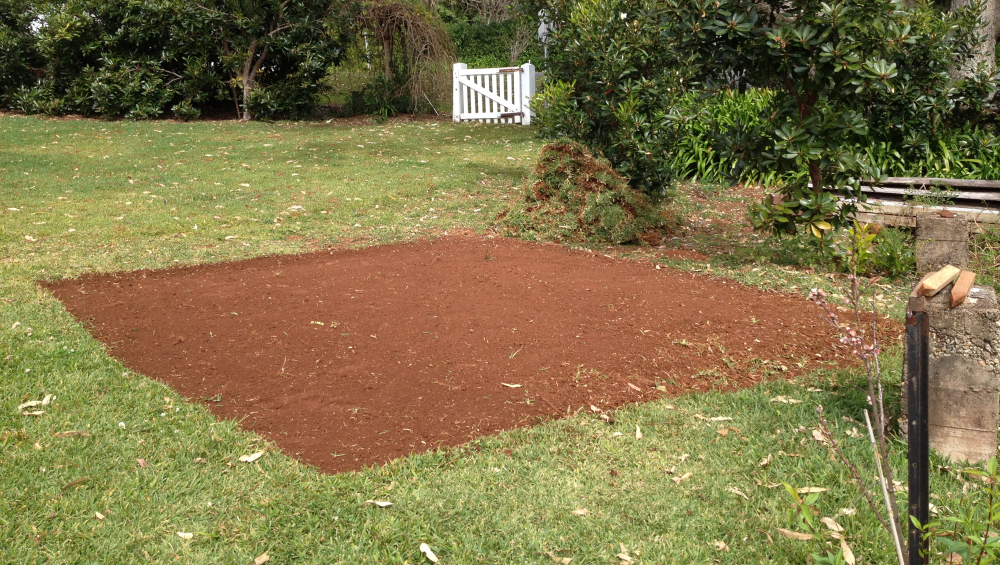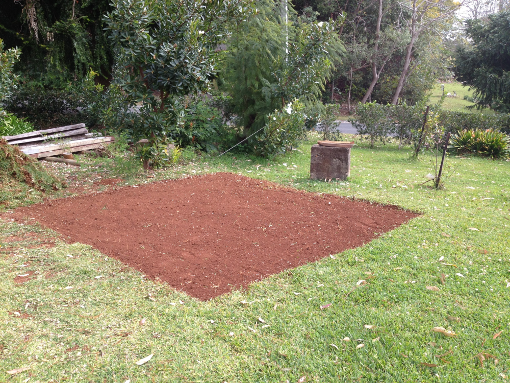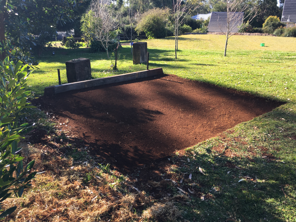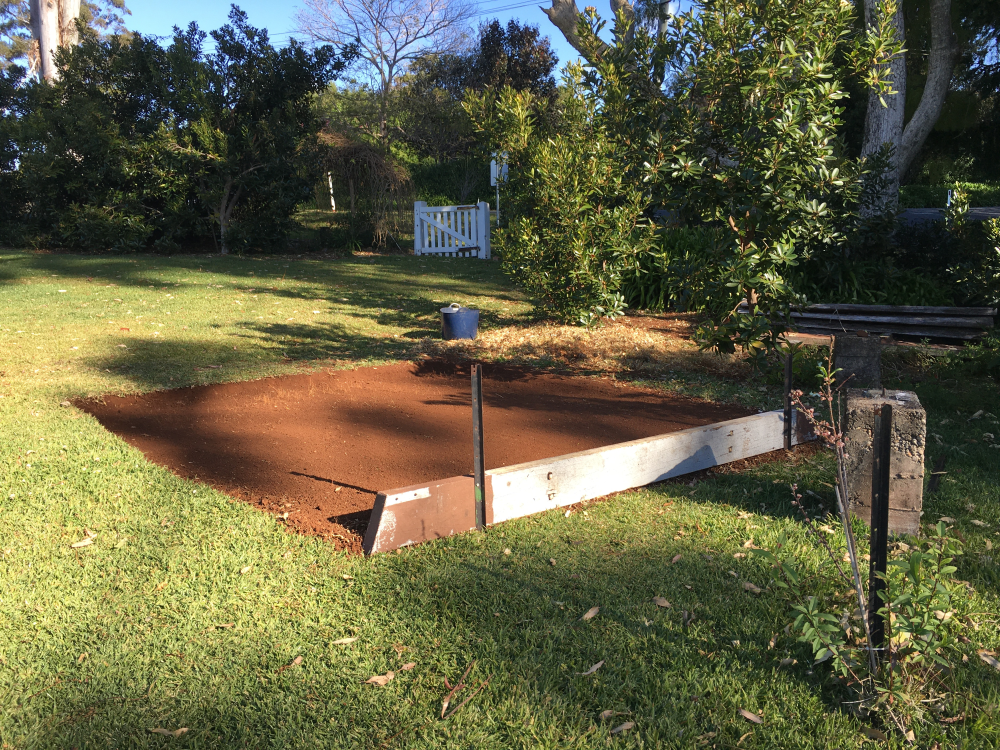 Joanne and Ray chose a reasonably level area at the side boundary of their large property. Our team removed the lawn and leveled out the then exposed soil.