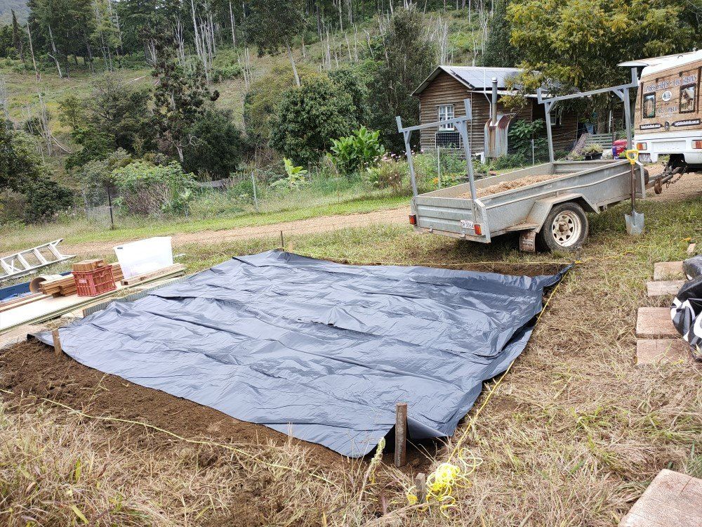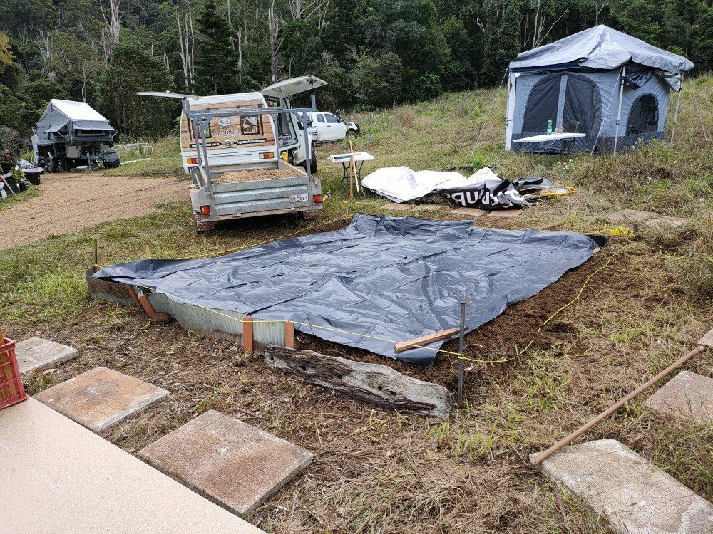 We finished the leveling and spread out black builder's plastic on top of the soil before spreading out brown road base on top.