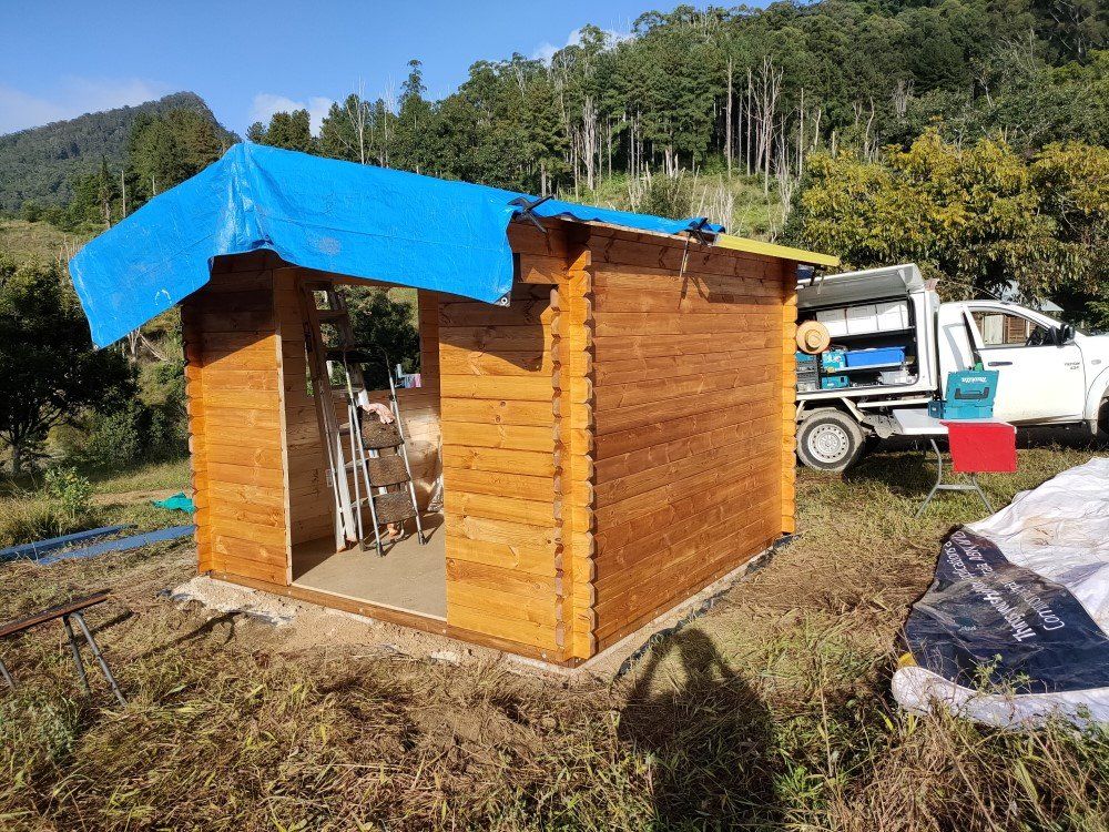 Despite frequent rain interruptions we managed to squeeze in just enough dry weather building time to get the cabin to a "sort of" dried-in state - even with the help of tarps if needed.