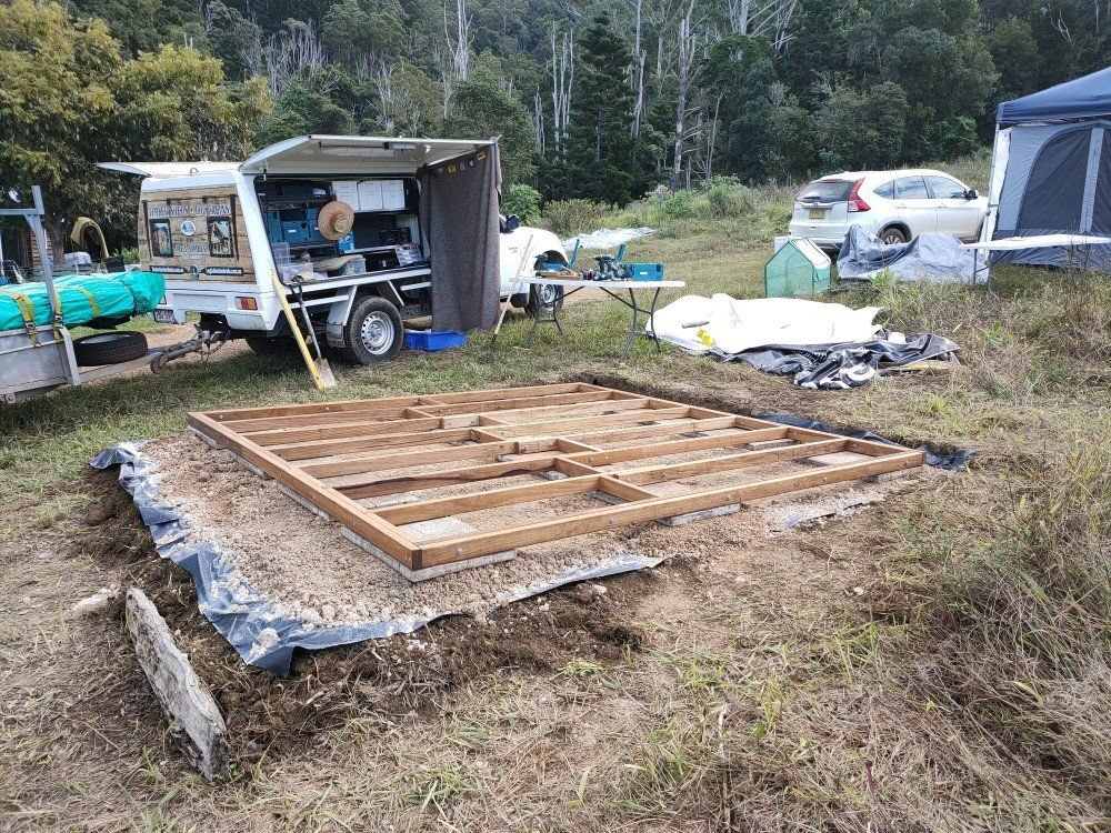 The most cost effective foundation is a simple hardwood base frame placed on top of road base and pavers. Due to the closeness to the ground termite protection is a must.