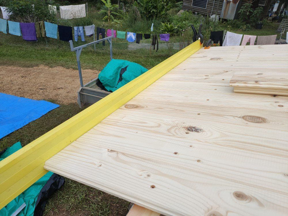 You will notice in the image on the right that we use a yellow builders' edge to align the roof boards 100% - not really needed as the roof edges are later on covered by timber anyway - this is just an example how we do things and how particular we are to ensure that you are totally happy with your new cabin.