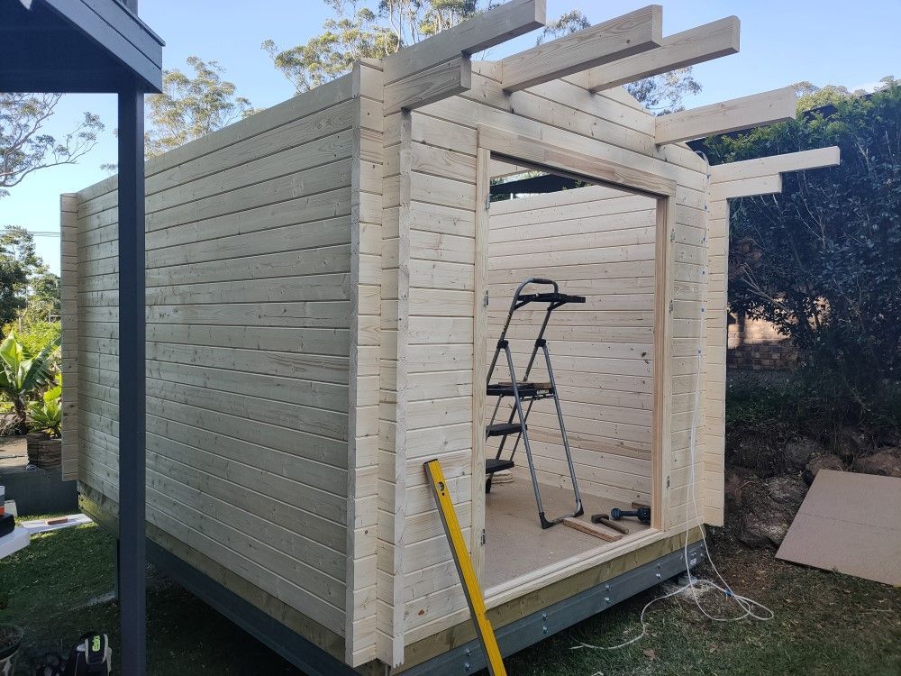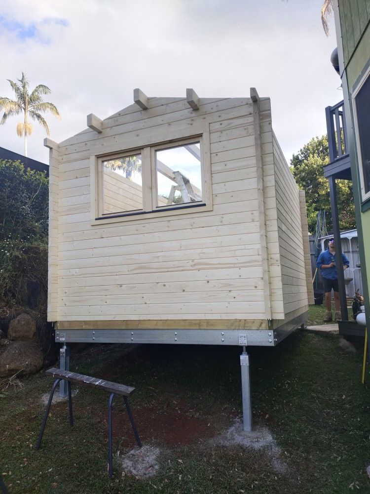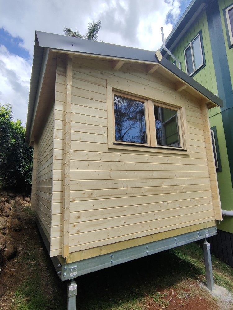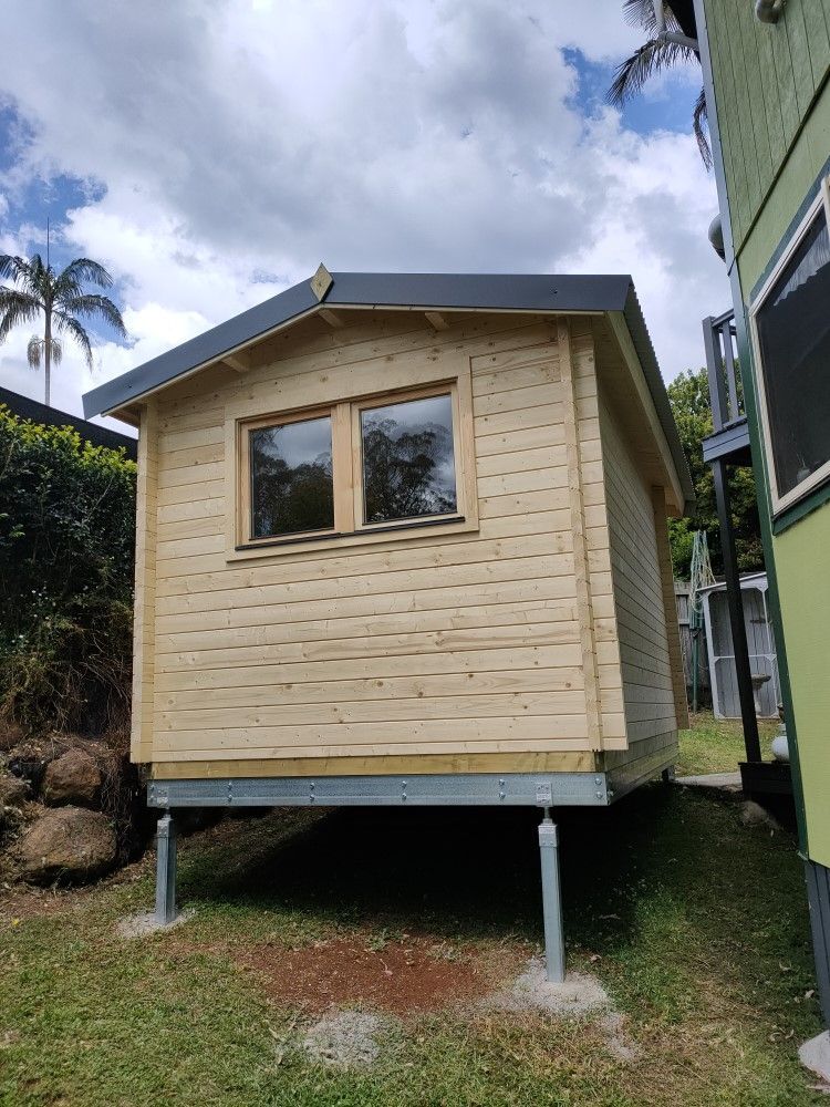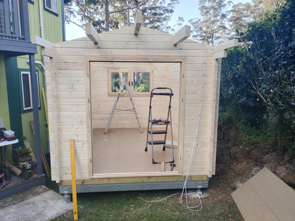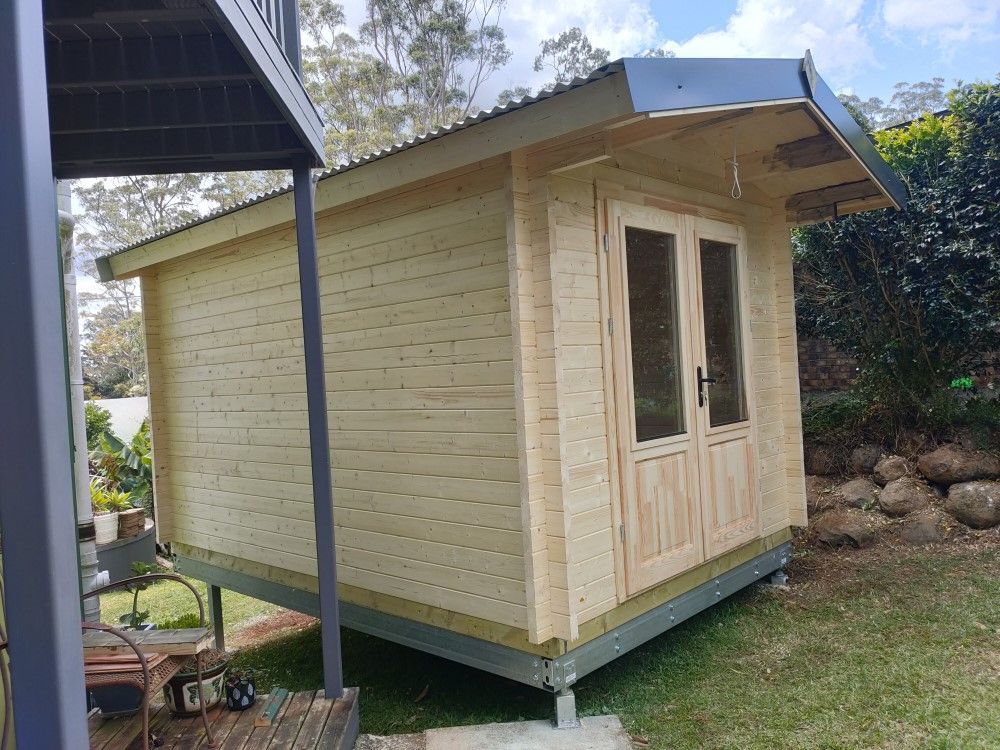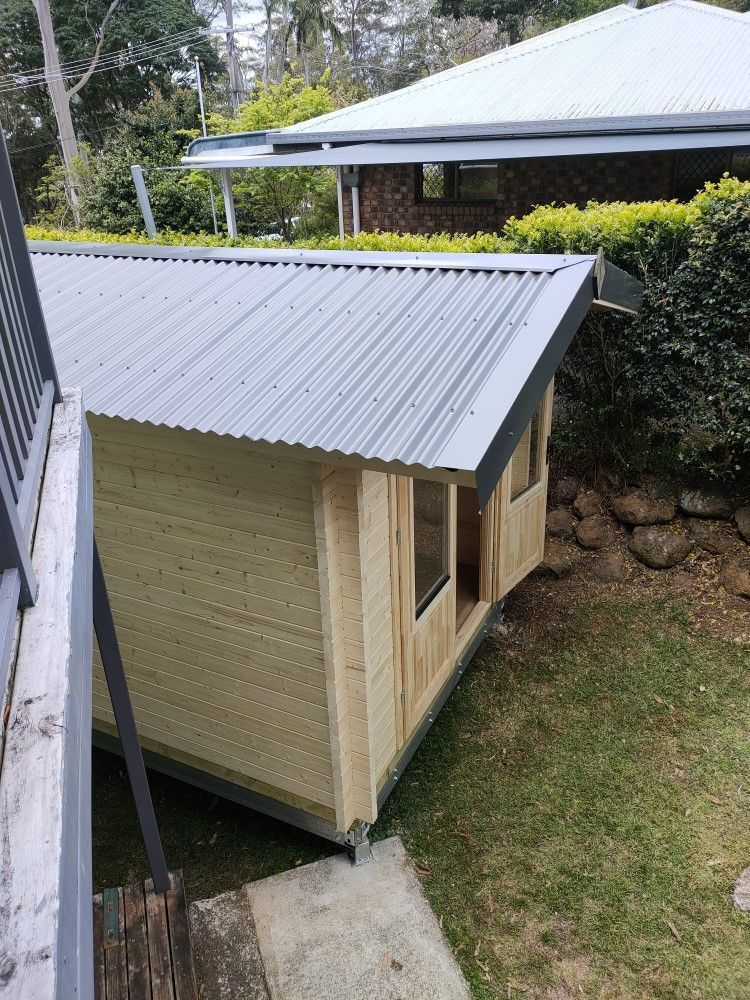 Another "CUSTOM" size cabin. Louise and Gordon have a corner block, so space in the rear of the property was extremely limited. But after a site inspection and giving our measuring tapes a bit of a workout we designed a custom size for Louise's new sewing studio. The chosen size was rectangular, the window was placed in the rear wall, and the slope of the site was overcome by using a steel base with adjustable steel stumps.