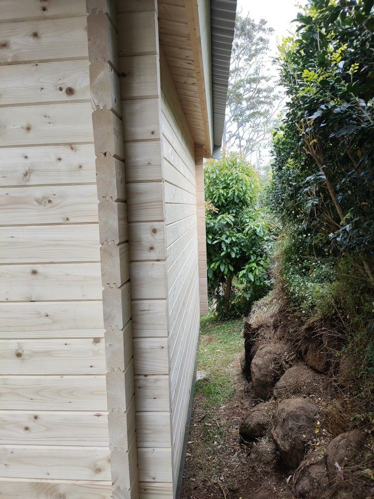 As mentioned, the space we had to work with was very limited, especially to the right of the cabin. The bolder retainer wall posed a bit of a challenge when installing the sideboards and eave reinforcements - but with a bit of good will and patience all got done. As always, the cabin needed to be 1 meter away from the neighbor's border.