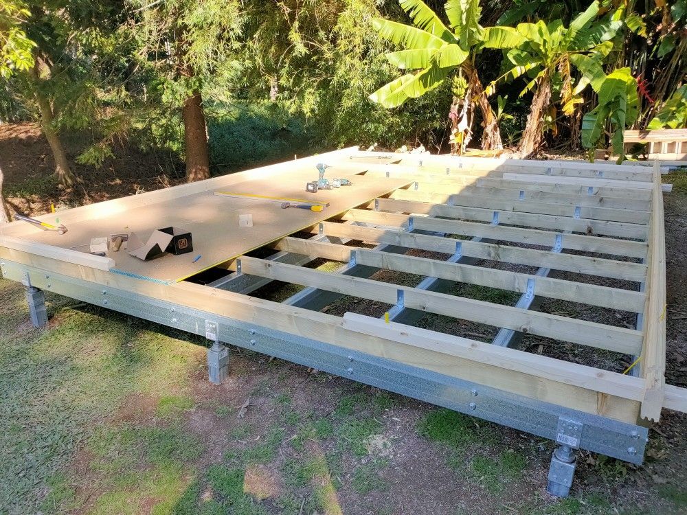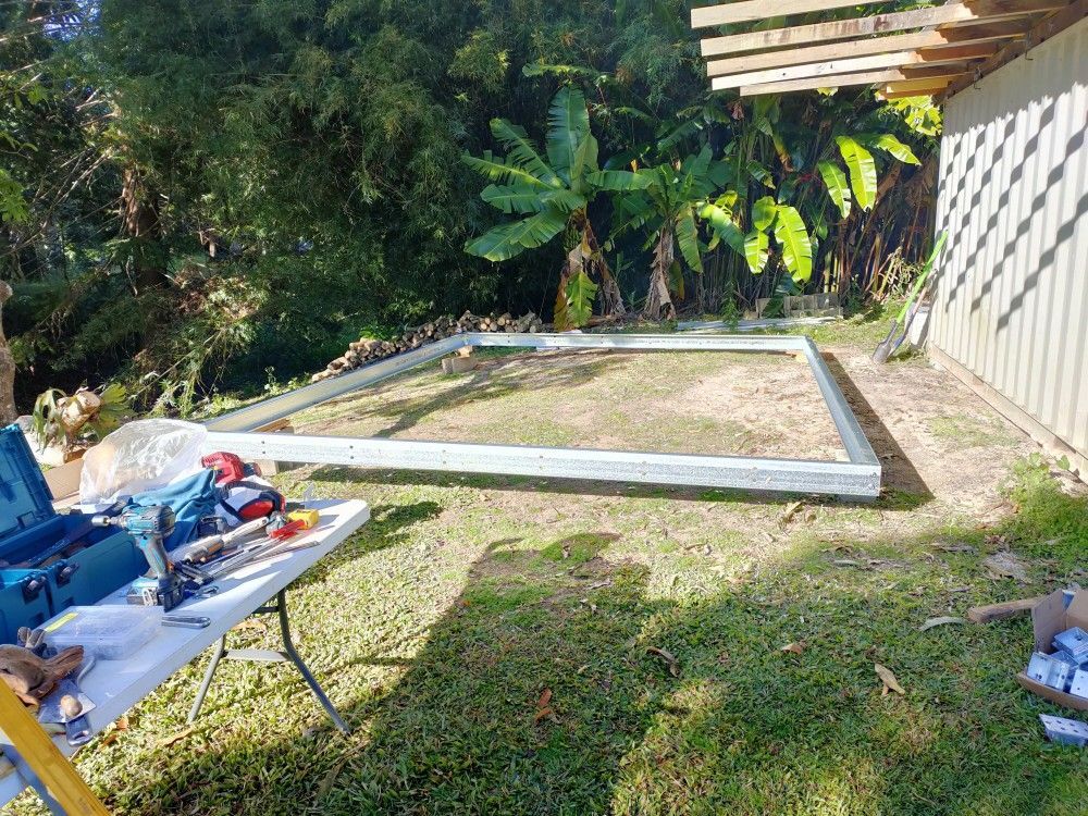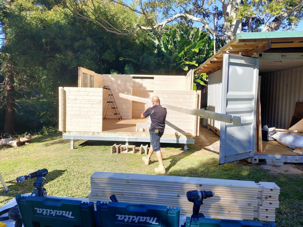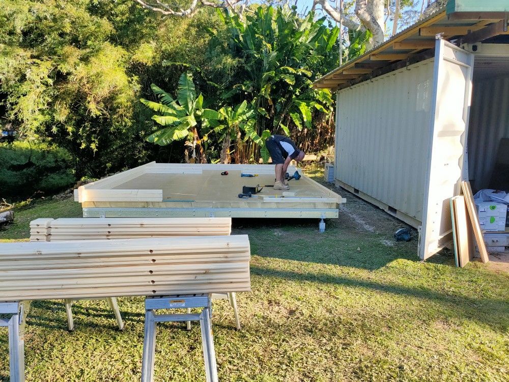 Once all electrical holes are drilled the first layer of logs is screwed onto the treated pine base frame. Floorboards are next to create a level even working surface.