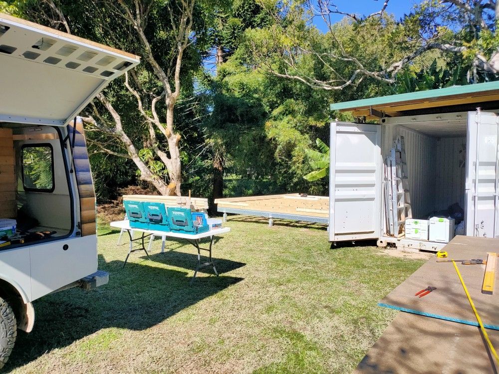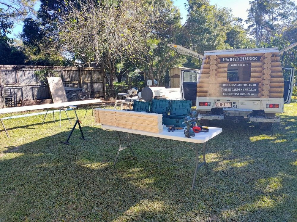 Cabin assemblies are always a lot easier if we can get our vehicles as close as possible. A flat area close by is also great as this makes unpacking, sorting and temporarily storing logs a lot quicker.