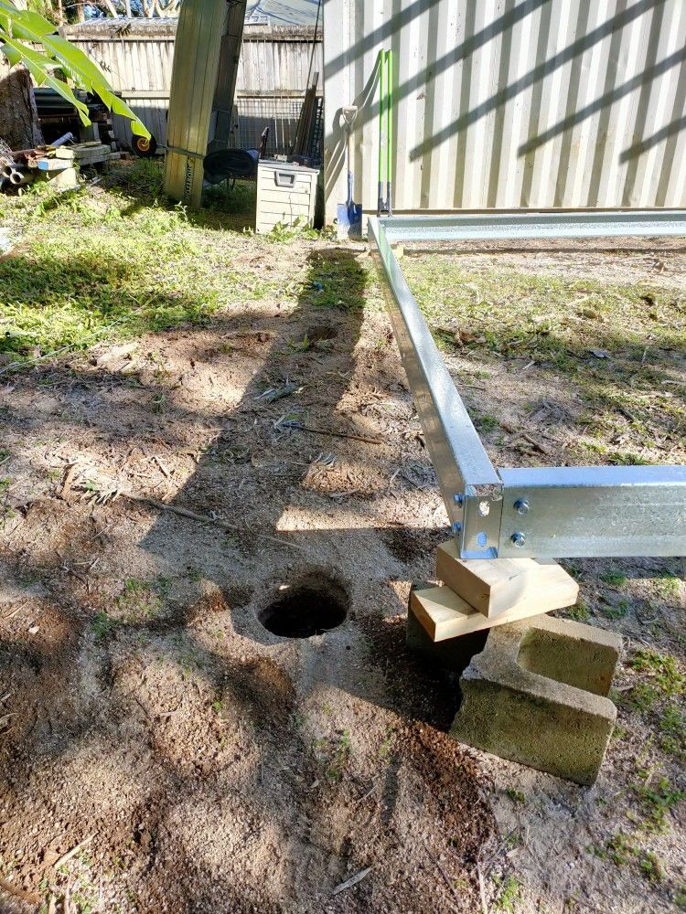 We first lay out the outer frame of the steel purlin base, and consult the owners as to its exact positioning. This gives us the location of the post holes. Once marked out we move the base frame out of the way, and dig the holes.