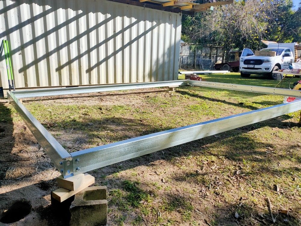 The treated pine base frame is assembled, squared up and secured to the steel purling base via metal angle brackets. The first layer of logs is placed, electrical holes are drilled through the treated pine base frame (all electrical holes through the centre of the logs have already been done by our factory) in a 45 degree angle to clear the steel purlins.