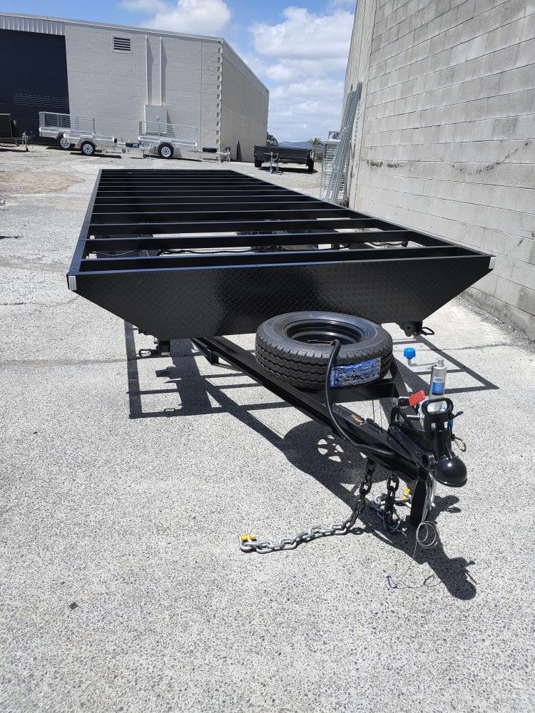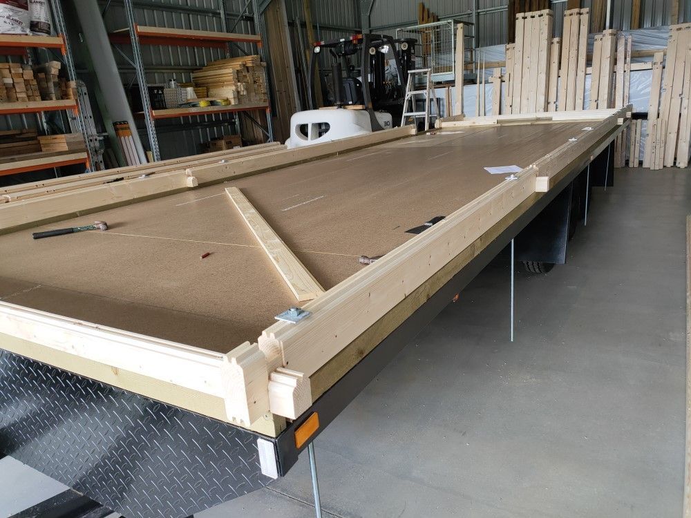 To legally tow a tiny house the trailer and the cabin need to adhere to certain limitations regarding size and weight. We opted for a flat-bed trailer rather than dropping the deck and having the wheel arches protrude into the cabin. This also means a better height off the ground, so in case the tiny house is placed near a river or like it is less likely to get flooded, plus provides an easy access to service connections.