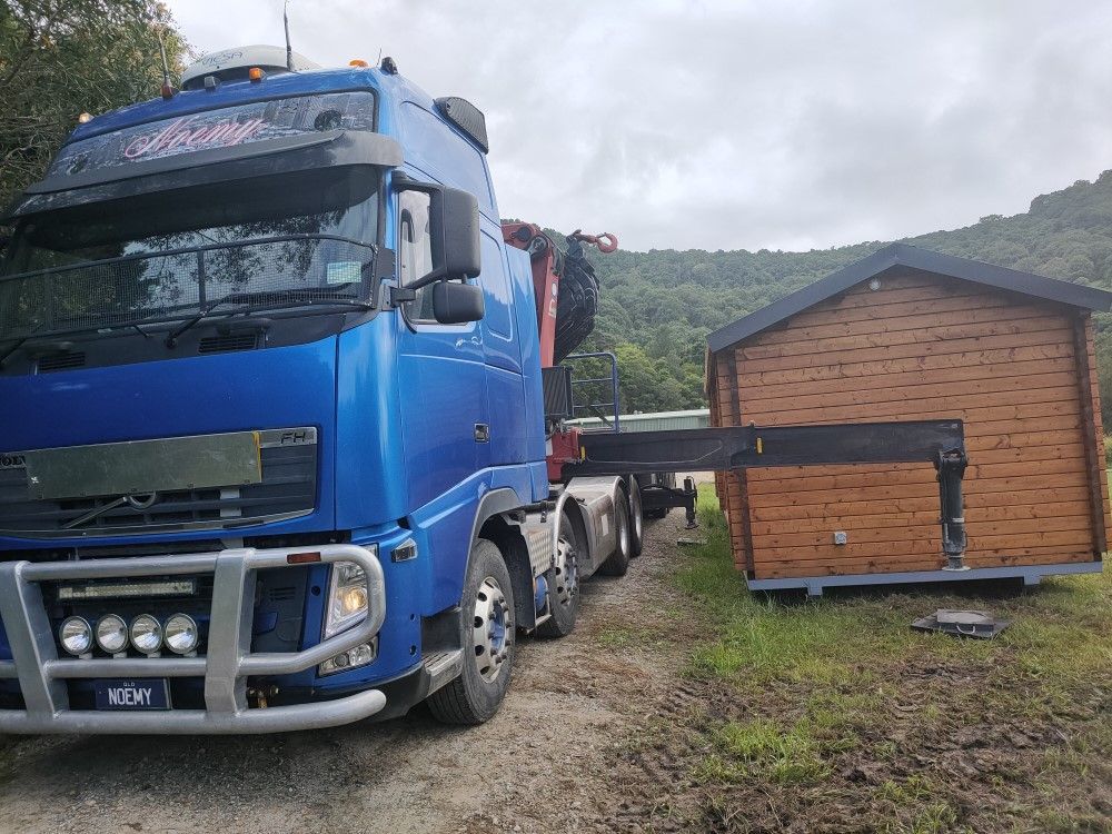 Due to it's overall height the cabin needed to be loaded on to a low-loader. The first leg of the cabin's journey was a bit "basic" - the cabin was pulled down a steep track on its skid. Second leg was on the back of a tow truck, transferring the cabin to a paddock near the main road. Third leg was lifting the cabin off the tow truck and transferring it on to the low-loader semi.