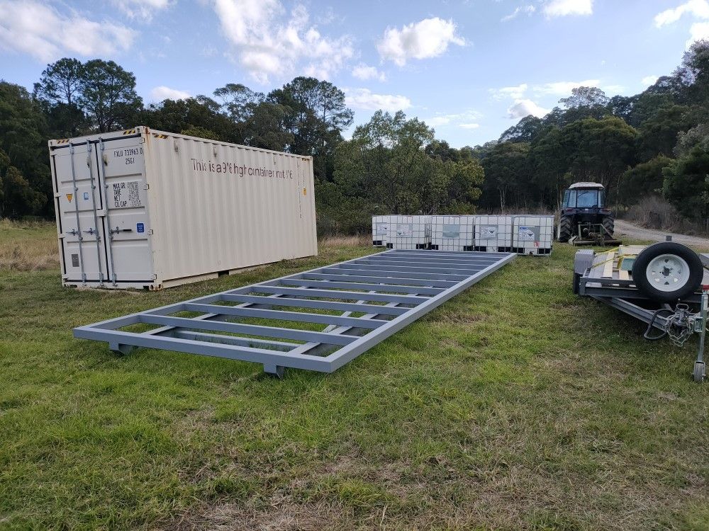A H2 treated pine base frame is directly attached to the skid, using high tensile M10 bolts that go though the timber joists and the outer steel frame of the skid.