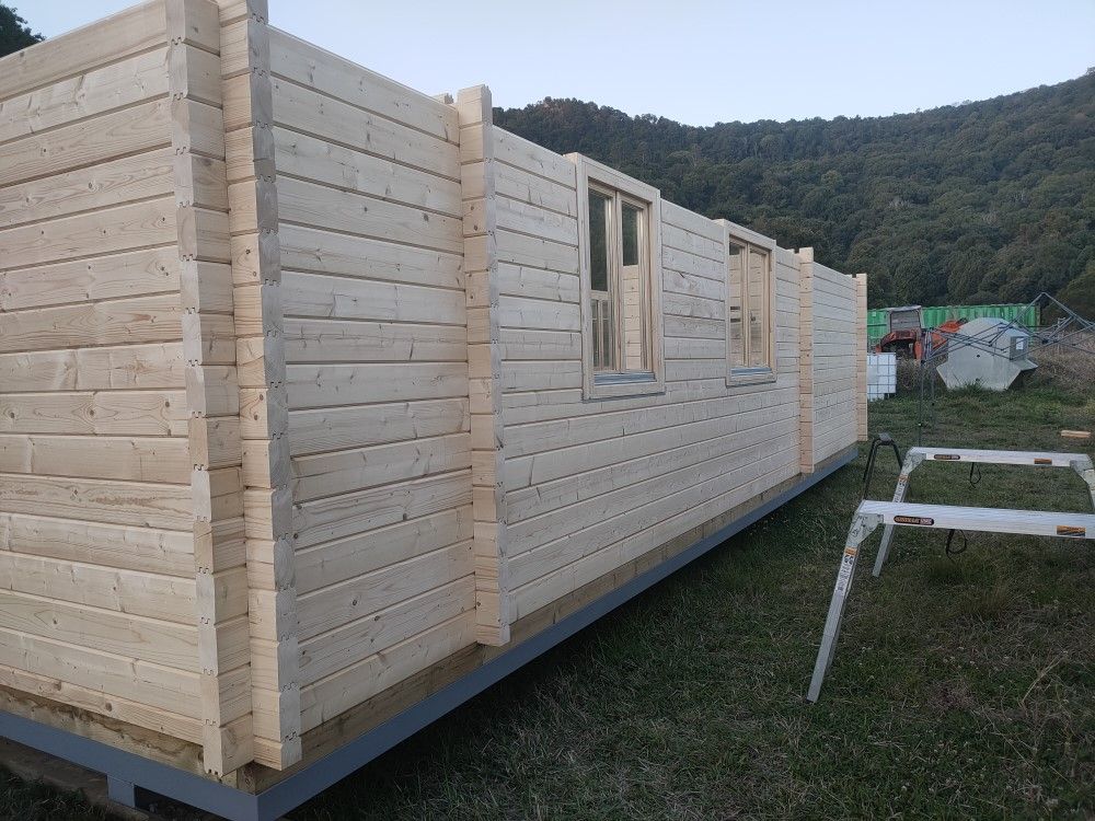 We spent the day before cabin pickup removing the roof sheet extensions we installed previously to get the cabin to a max. width of 3.5m, taking the diamond shaped gable top pieces off, securing the already installed shower screen and the windows etc - in short ensuring that nothing could get damaged during transport. The heavy duty metal skid foundation of the TORSTEN cabin guarantees torsional stability and provided proper lifting points.
