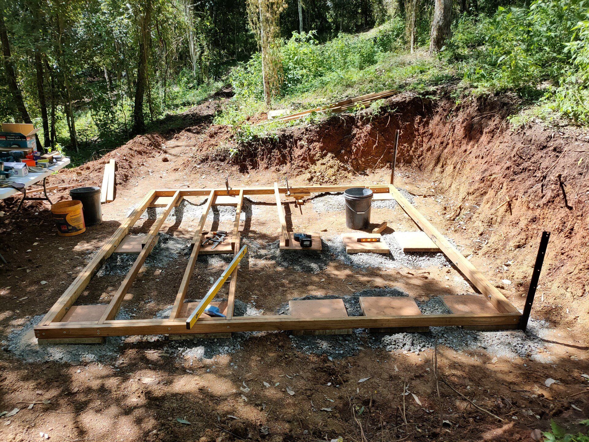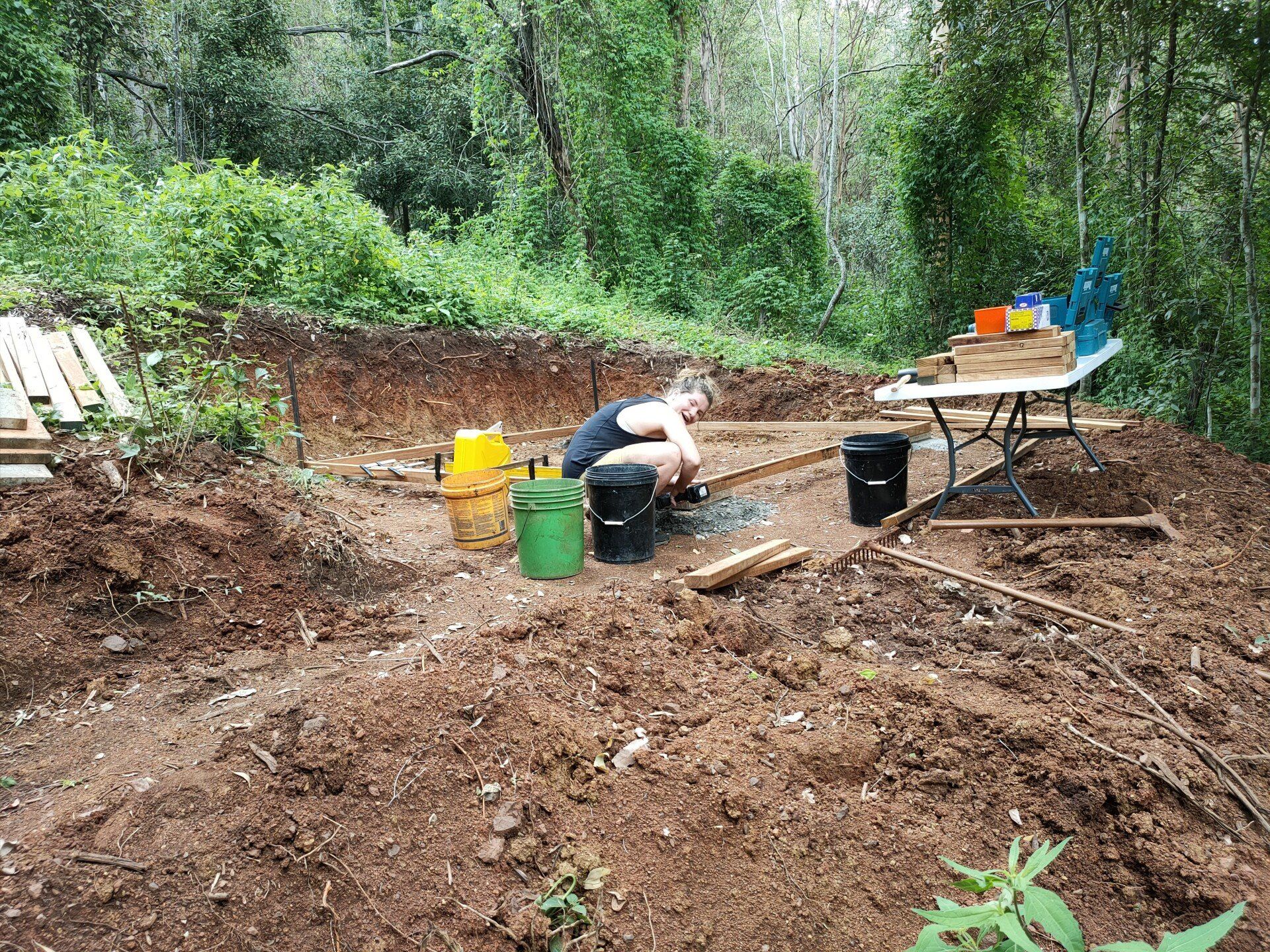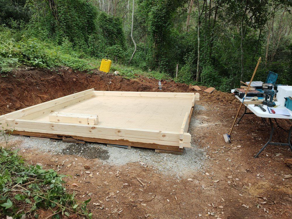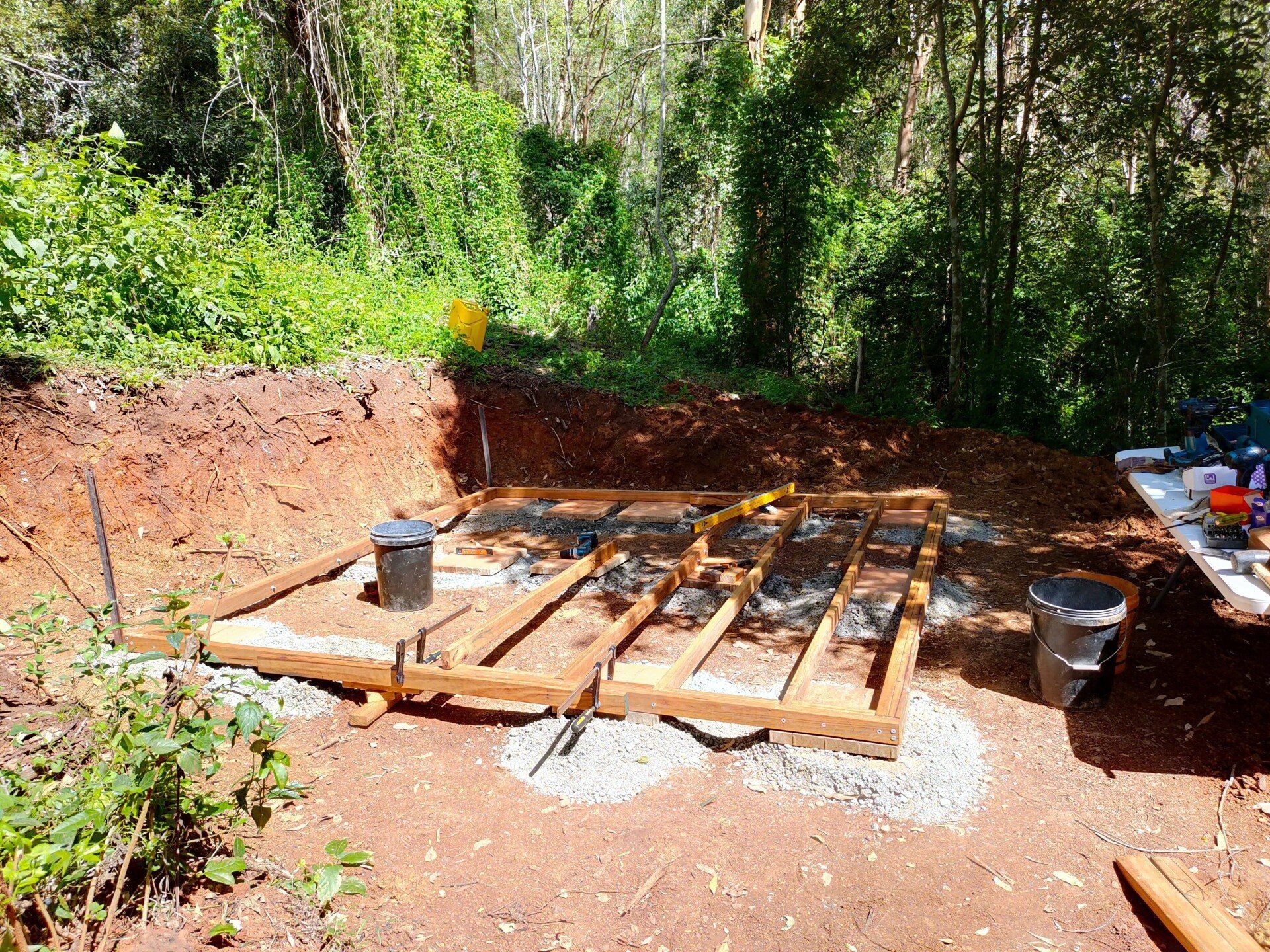 The building envelope was created by digging into the hillside far enough to create a building patch that allowed the cabin to be placed on original undisturbed soil, rather than partly on top of the dug-out soil that was placed on the valley side of the patch.